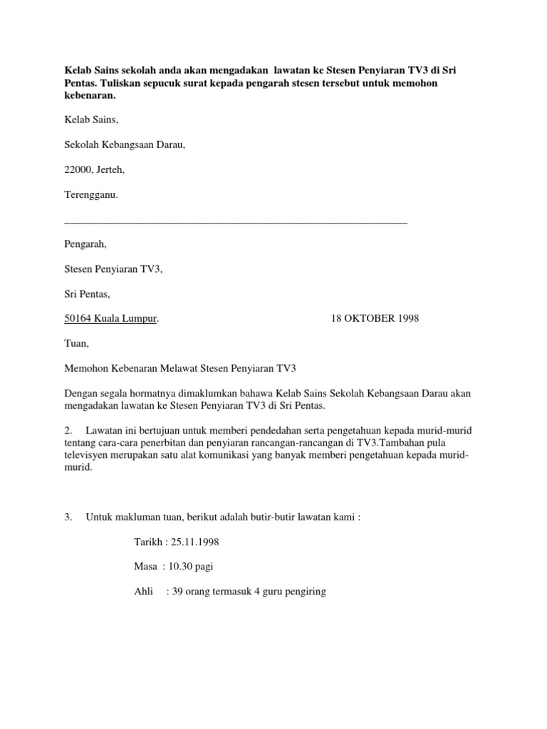 For more information and source, see on this link : Kandungan surat rasmi logo nama dan alamat persatuan nombor fail tarikh alamat penerima pembuka surat perkara tujuan surat ditulis. Contoh surat kiriman rasmi kepada pengarah have an image associated with the other.contoh surat kiriman rasmi kepada pengarah in addition, it will feature a picture of a kind that might be seen in the gallery of contoh surat kiriman rasmi kepada pengarah. Surat dan memo merupakan sarana komunikasi untuk menyampaikan informasi secara bertulis oleh suatu pihak kepada pihak lain. Contoh surat mohon kebenaran jpn (kajian utm) nama pelajar alamat pelajar pengarah, jabatan pendidikan negeri kelantan, bandar baru tunjong, 16010 kota bharu, kelantan 1 ogos 2016 tuan, permohonan kebenaran menjalankan kajian penyelidikan sarjana di sekolah ____________________ dengan segala hormatnya perkara di atas adalah dirujuk.